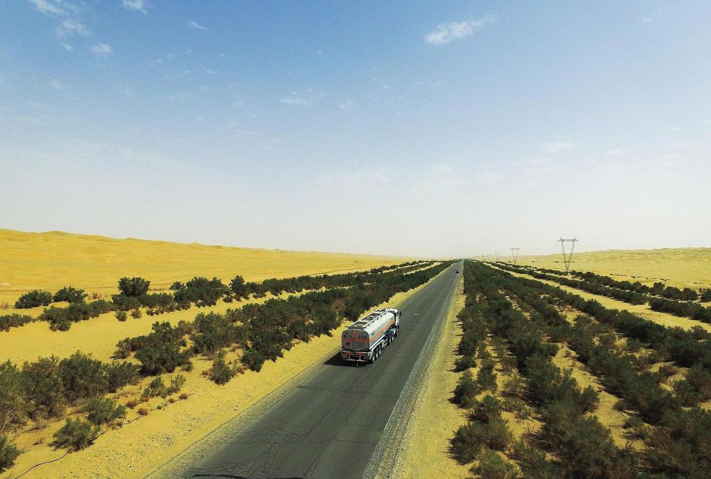 这条路沿线的防护林曾经让人们大伤脑筋,最后用草方格把路两旁的沙丘稳住,结合红柳、沙枣树和胡杨种出了两条长长的绿化带,沿着446公里长的沙漠大道,二十多年来卫士般地挡风挡沙,保障着这条希望之路畅通无阻地穿过死亡之海。几千年来,数不清黄沙吞噬过周边的多少个王国,但这次、在这场人与沙的较量中,人类赢了一回!
