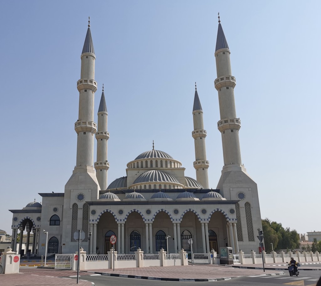 乘车穿梭于鳞次栉比的高楼中,仿佛置身于一个完全现代化的世俗世界,以至于在沙滩上看到穿游泳衣的女孩子都没惊讶,倒是中途停下来参观阿尔哈塔卜清真寺(Al Farooq Omar Bin Al Khattab Mosque)时才意识到这里的宗教色彩。这座清真寺据介绍是仿照土耳其的蓝寺(Blue Mosque),白墙蓝顶,四周的塔楼尖尖地高上去,显得精致典雅,风格跟新疆的不太一样。