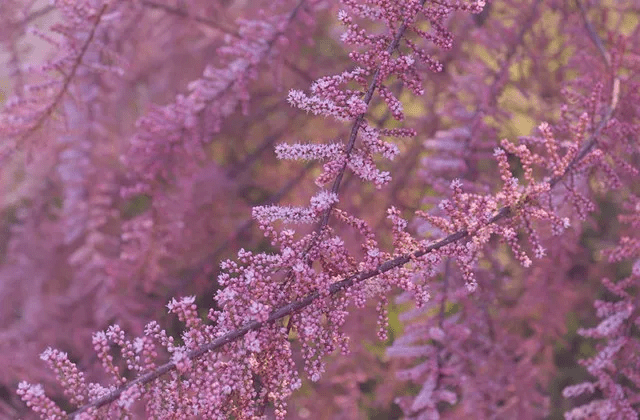 新疆的大漠边上时常能见到红柳,是人们用来治沙、绿化的功臣树种,学名叫柽(chēng)柳,是一种能长到三、五米高的灌木,那些体型高大的老树也能像乔木,不过更多的就只一人多高,或者再矮点儿,一丛丛的。它的枝条如柳条般柔韧,老枝灰褐色,树皮比较粗糙,新枝则呈新鲜的红棕色,细细长长地向上生长,略带一点弯曲的弧度,不见得垂落,却仍显婀娜。其叶子像柏树,细小、鳞片状的针叶一片片地紧紧贴在枝条上,这是为适应干旱环境自然演化而成的一种性状,以植物特有的智慧最大限度地减少水分蒸发。花朵也小得像针叶,花瓣得拿着放大镜凑近了看,隐隐约约地能看见花蕊。花朵是扎堆序生的,在靠近枝头的那一段,一簇簇深深浅浅、浓浓淡淡的紫色小碎花,密密麻麻、整整齐齐地排满纤细的枝茎,让那段枝茎看起来像个毛茸茸的小细刷,苗条得又似瘦身版的紫藤花,一条条地给红柳丛笼上一层幽幽的梦。