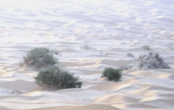 和田还算轻的。且末与若羌之间的沙漠有一段一年到头只有一个状态——风沙,一场风沙从年头刮到年尾,只有大与小之别,大时狂风卷起滚滚黄沙浩浩荡荡地横扫一切,是和若铁路修得最艰难的一段,最后的方案是建成长长的铁路桥,让涌动的沙河从桥下流过。从飞机上看沙漠边缘的和若铁路一带,晴空艳阳下飘浮着灰蒙蒙的沙尘,像雾又像烟,尘雾中被黄沙浸蚀着的零星绿洲看起来发灰、发黄,似乎该叫灰州、黄州。历史上曾有多少个闻名古国、无名部落,都被淹没在这茫茫沙海之中。