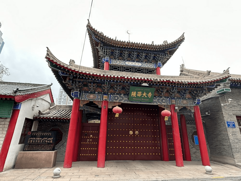 绕过书店拐到建中路,一栋飞檐翘角的中式建筑非常抢眼地闪了出来,这便是陕西大寺了。历史可以追溯到乾隆年间,经过战争搬迁到了现在的位置,是乌鲁木齐最大的一个清真寺,能容纳上千人,为四合院式建筑,沿街的侧墙不记得从哪年起变成了门面。很开心地从一家回民服饰店买了一顶新款的纱巾帽——这些天在街上盯着别人艳羡了很久,现在好了,等一下进寺里时就戴上。拐到永和正巷上的正门前,门关着,左侧的小门上贴着“推”,就推了推,里面反锁着。不甘心,来来回回地把几个大小门都推了个遍,没一个能打开。从门缝望进去,院里停有两辆小轿车,也不知怎么开进去的。回到纱巾店里打听,说是还在维修。有点失望,再回到大门前,看起来像是新刷过,朱红大漆的柱子,暗红色大门,金色吊耳铜环。喜欢这样的配色,沉静不俗。头顶上的门楼雕梁画栋、匾额斗拱,蓝绿白红黄色彩斑斓,细看上面的图案,全是花卉、花纹、树叶,不用明显的动物图文,遵循着伊斯兰教义。门楼有两层,比两边的厢房高,可能用做宣礼塔,飞起的重檐彰显出这座大寺的地位。