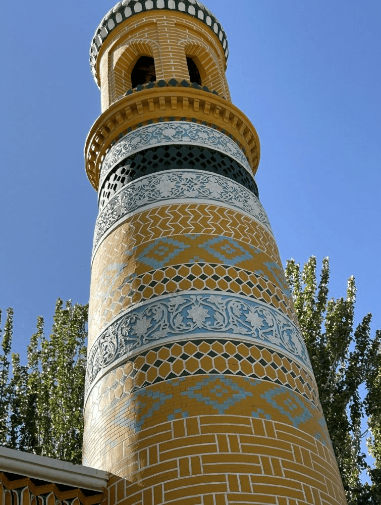门楼是平顶、带尖拱门,后面是浅灰色的大穹顶,上有一个拱形塔,被高高的门楼挡住了,要站在侧面或进到院里才看得见。门楼的平檐下有一溜精致的砖花,黄砖墙上镶着白色的边边框框。两边的宣礼塔为传统的深绿色圆顶,顶边整齐地排列着一行白色尖拱形图标,跟下面的拱形窗、旁边的拱形门相呼应,构成穹窿式的小圆塔,塔尖上的新月象征新生力量、未来充满希望。塔身以黄色为底,上有一圈一圈的两方连续、四方连续几何图案,黄、蓝、白、绿相间搭配,白框镶出重重叠叠的六边形,蓝色砖摆出的菱格则嵌入墙体中,另有三圈以淡蓝为底色、用石膏材料雕砌而成的白色缠枝花卉浮雕,不论整体还是细节,风格朴素简洁、高雅明快。两个塔楼与门楼的距离并不对称,左边的远一些,多两道镶白框的尖拱形凹陷做装饰,令视觉上有变化感。整体造型考究得如同木卡姆的制式,在遵循规则的基础上自由地流动,别具一番风韵。不禁赞叹:一方水土养一方文化。