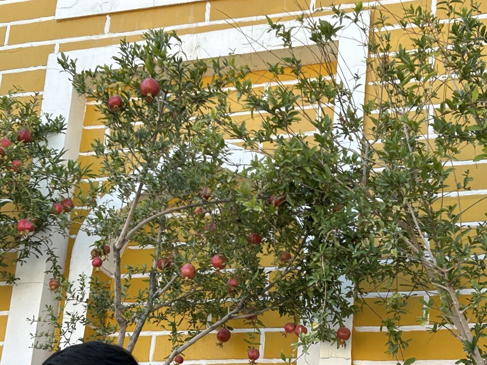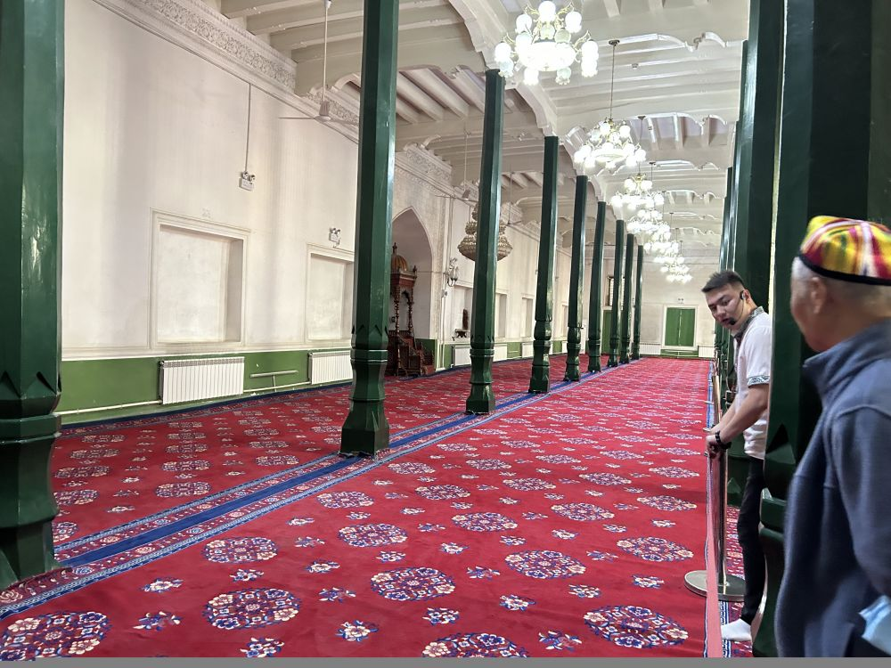 时间到了。登上几节弧形大台阶,门旁的石榴树结满了红色的果子,这是喀什有名的地产。进门是个接待大厅,买好票,随游客从左边进入院中,大门的正对面是大礼拜堂,左右两侧是厢房,墙上的绿色木窗搭满棂格,跟中原风格有同曲同工之妙。院子巨大,院中又有两个召唤塔分别而立,是呼唤教徒做礼拜的地方,提醒人们自省。大殿为长方形平顶,外有长廊,铺着地毯,天热时人们可以在这廊上做礼拜。按规矩,凡是进入大殿都要脱鞋,游客们纷纷脱下鞋,放在旁边的鞋架上。