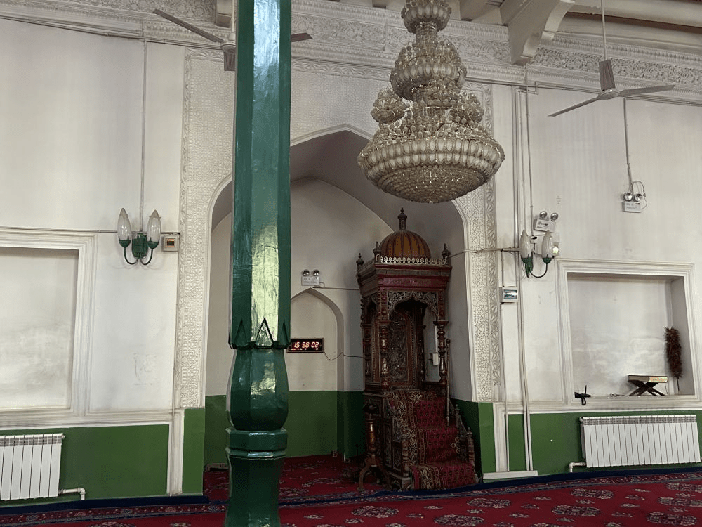 真是个大殿,长140米的殿内林立着158根绿柱子,与殿外的几排柱子相呼应,当年由上百名匠人手工打造而成,每根不重样。没看见椅子,但地上铺着织有花卉图案的深红色纯毛地毯,给没有装饰、显得肃穆的白墙增添了气氛。与其它祭拜场所不同,清真寺讲究清规戒律,极少有装饰。西面的墙正中有一处凹进去的尖拱形壁龛,典型的伊斯兰风格,摆着一个红漆木质的轿式宝座,有台阶,雕工精细,极其精美。这个壁龛是毛拉讲经的地方,经书摆在旁边的方形小壁龛处。伊斯兰教的圣地麦加在西面,麦加的克尔白天房被称为“禁寺”,乃圣地之圣地,《古兰经》写道:在做礼拜时,“你应当把你的面转向禁寺。你们无论在哪里,都应当把你们的脸转向禁寺。”因此所有的穆斯林都要朝麦加的克尔白天房礼拜,每天五次。