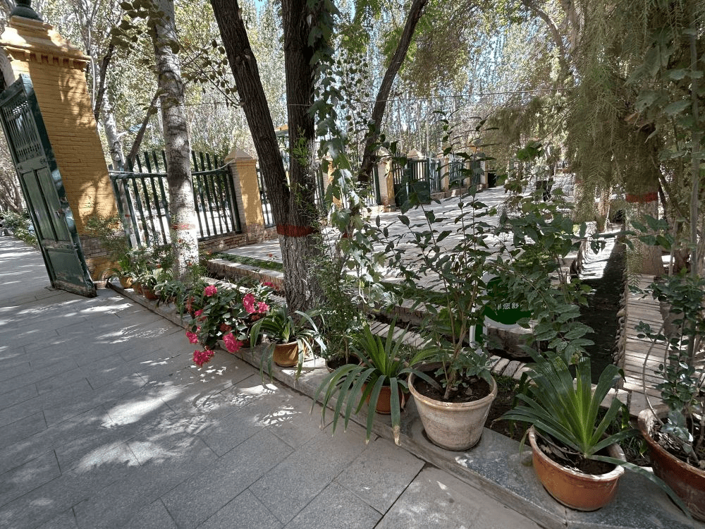 老坊寺?我知道呀,怎么不记得有这个符号?随他绕过龙泉街上的民街,来到与新市路的交叉口,那座翻新过的绿色飞檐屋比以前神气多了。定睛一看,果然有!墙上有万字铁符,不过门离得远,不确定是否有寿字纹。想不起以前为啥没注意过。老坊寺跟陕西大寺是一先一后的兄弟关系,都是当年来疆的陕西回民敬奉真主的地方,但不巧这个老坊寺也锁着大铁栏杆门。宽宽绰绰的院子里有沙枣树、葡萄架和一块小菜地,从旁边厢房走出位戴头巾的女子,手里端着一盆水走到葡萄架下,给菜浇水,扭头看见我,冲我摆了摆手,示意不对外开放,就转身回屋里去了。我更晕:她怎么在这里?后来一想,可能阿訇就住在里边,她是家属。
