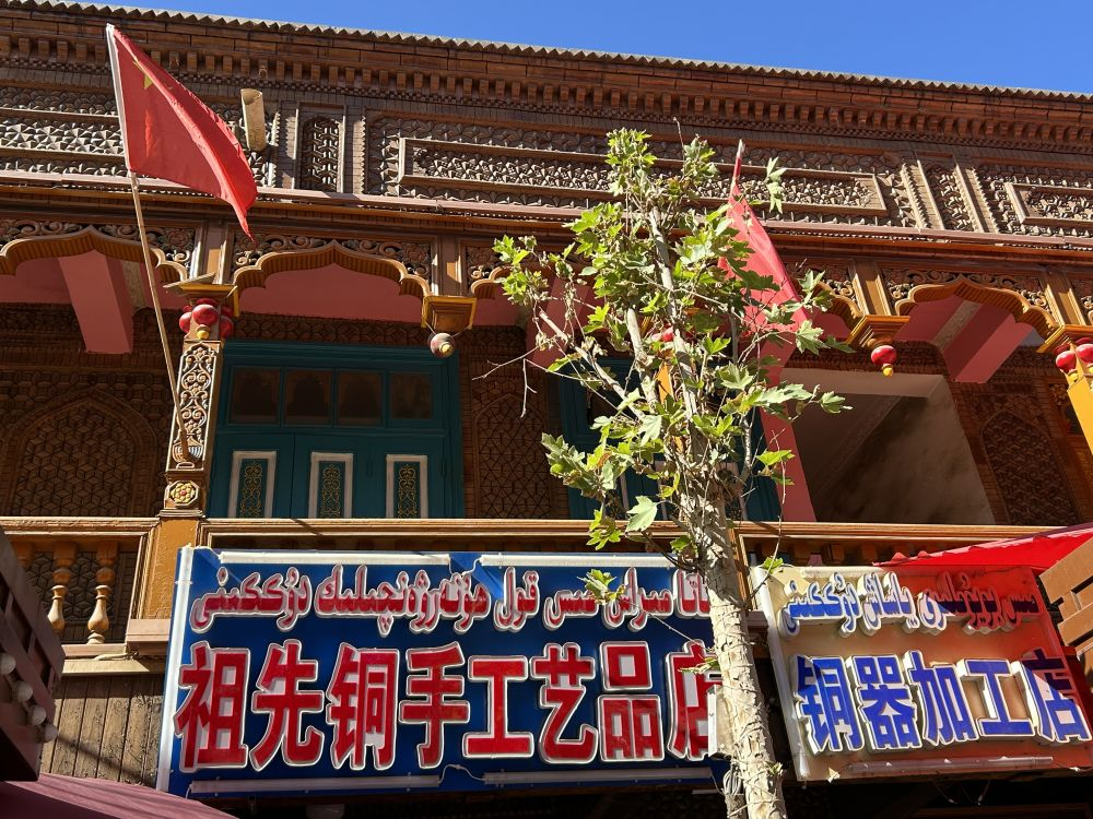 哇哈,这个适合我!立马就上车,舒舒服服地坐下,头顶有棚子挡太阳。还以为步行街就只能靠两条腿呢,头不那么晕了。等满坐后,司机、导游俩美女带着一车人沿古城的街道畅游,用好听的维吾尔语腔介绍着帽子市场、丝巾市场、地毯市场、铜器市场等等,哪条街有哪些有名的小店、哪个小店有过什么故事,并不时地敲敲悦耳的小铃铛告知路上的行人:我们来啦!常有人专注地在路旁采购,没听到铃声,也没听到导游边笑边叫,一车人都瞅着乐,等顾客反应过来,也不恼,让开道跟着乘客一起乐。喀什的风情便这样在笑声中洋溢。