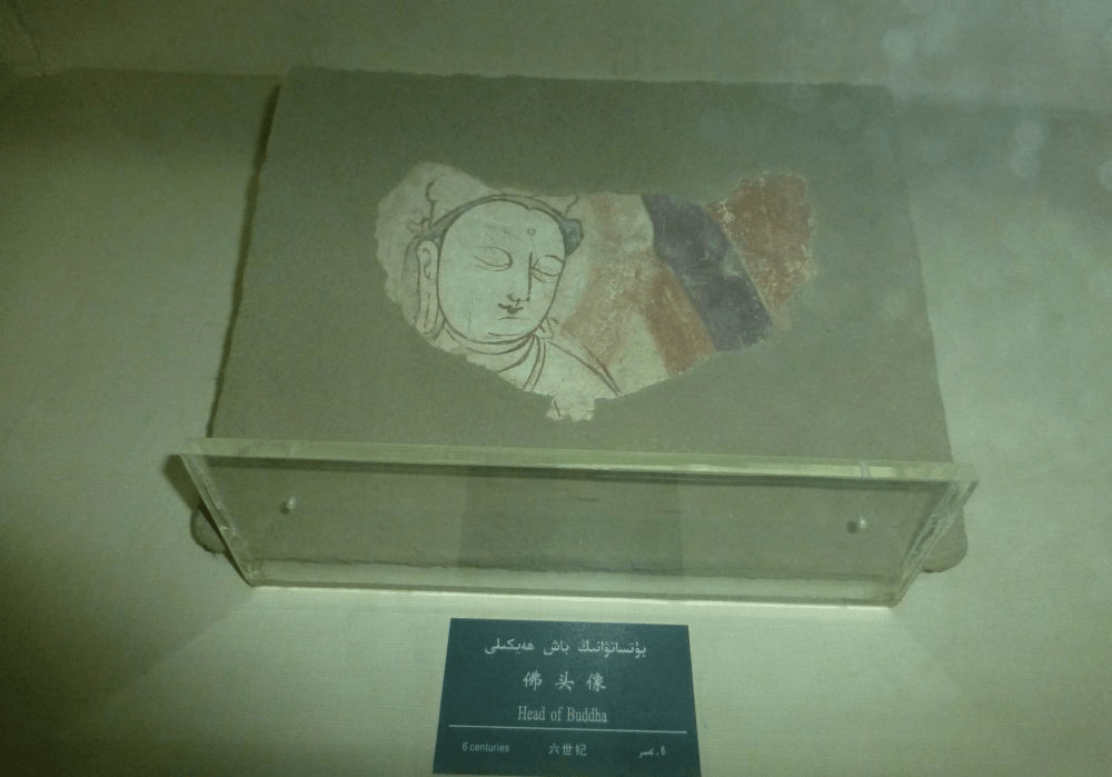 不同于其它两个区,博物馆里汇集了这几个区出土的文物,展出的壁画都是真迹,此外还有雕塑、版画等,都色彩逼真、神态生动,人物衣裾自然服帖、线条流畅,顺应“曹衣出水”。壁画在技法上使用屈铁盘丝式的铁线描勾勒,结合凹凸晕染的手法,让画面有力度、有动感,属于历史上著名的于阗画派。画中的人物僧侣较少,大都是世俗中人、世俗题材,人物着装除个别穿印度裤装外,其它均为典型的中原装束,另外混有几幅胳膊缠着薄纱的裸体人像,显示这个时代的壁画已从早期的犍陀罗式风格有所转变。有一幅画的人物面部很像历史书中的李世民或李白,不知是谁借鉴了谁。在被视为镇馆之宝的千手观音壁画残片中,神态若有所思的菩萨正随着万方乐奏舞翩跹,头戴宝石花冠,项链是配有和田玉吊坠的玛瑙珠串,耳坠则是一朵莲花串着一长串石榴花,每一条手臂上都画有手镯、臂环,似能听见环佩叮当。华丽的配饰让观音看起来雍容华贵,一个半千禧年之后的残片仍如此旖旎绚烂,当年的完整图画该多么色彩斑斓。更有趣的是,这幅画右上角的那只手掌托有一只老鼠的形象。根据当地古老的传说,于阗国曾遭遇匈奴大军大举入侵、兵临城下,苦于将寡兵微,于阗王束手无策,于是按老百姓风俗焚香求拜鼠王庇护,当晚梦见头戴金冠的鼠王让他放宽心,只管明早开城迎战,定能大获全胜。第二天早上于阗王将信将疑地照办,打开城门一看,敌兵正手忙脚乱、溃不成军,原来他们的鞋带、裤带、盔甲绳、马鞍带等等在半夜统统被一大群老鼠给咬了个稀巴烂,唯有束手待毙,于阗军不战而胜。从此于阗人将鼠神与佛神共同侍奉,《大唐西域记》对此有记载。