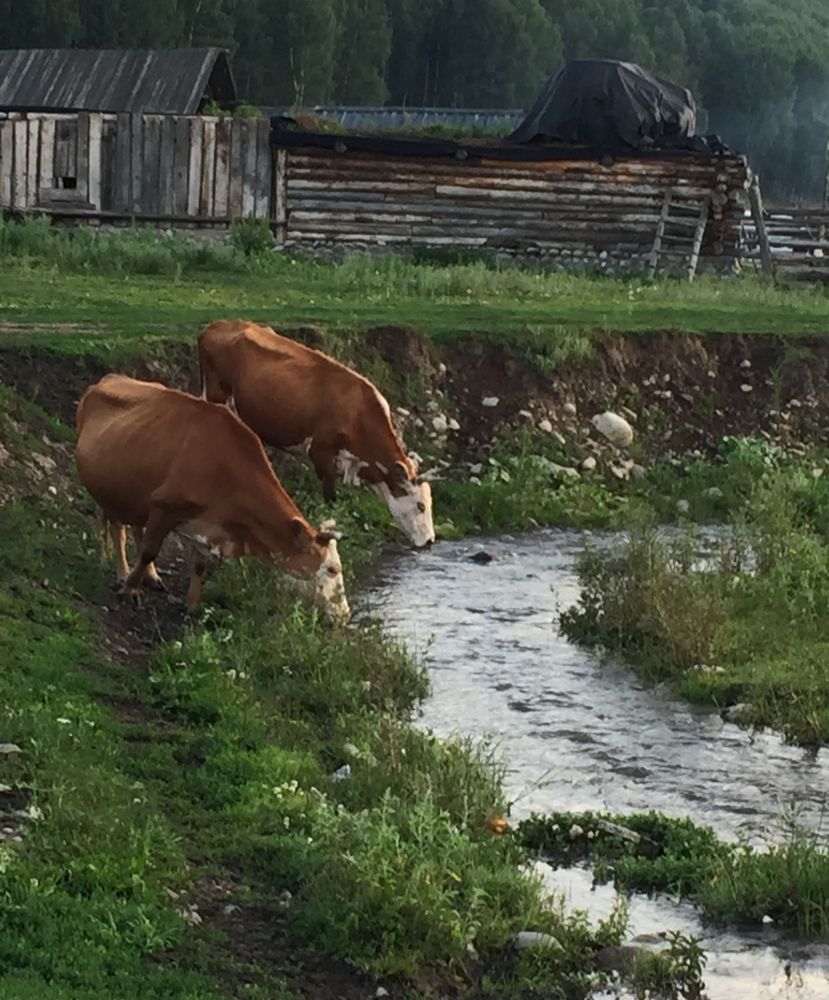 跨过一条小溪,看见有人在溪边盖房子。他站在梯架上,把一根圆木摞在铺着一层草的另一根木头上,然后在这根木头上铺一层草,再搭下一根。妹夫解释说这种草遇水会膨胀,从而填满木头之间的缝隙,才能挡风。小木屋尖顶的设计可以抵抗大雪覆盖,但在房间里是则平顶,尖顶与平顶之间的三角形空间是图瓦人的贮藏室,里边放满了干草:在冬季,禾木的雪能有两米深,那时牛羊就吃储存的干草。就地取材、因地制宜,多聪明的设计!这是一个世纪前白俄罗斯人留下的工艺。不同文化之间这样融合,如果没有战争杀戮,人类的生活该多么美好。