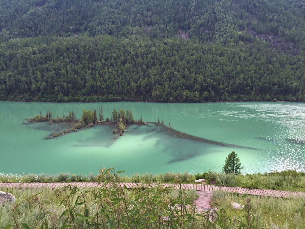 乘车上得山来,又跟随着“大部队”走了一截才到湖边,这就是向往已久的喀纳斯湖:一片平静、泛着粼粼波光的湖水镶嵌在郁郁葱葱的大山之间,山上布满了挺拔的云杉,外围则是高耸的雪山。每年雪山上的融水夹带着矿物质流入湖中,使水位随季节的变化不断升降,颜色也跟着变换,有时青灰、有时碧蓝、有时深绿。而眼前的湖水是蓝绿中泛着乳白,因为这个季节,上游的白湖有大量白色的湖水顺着河湾注入喀纳斯。湖水很深,传说曾有水怪出入,令喀纳斯多了一层神秘,但其实是一种生长在冷水湖中的巨型鱼。